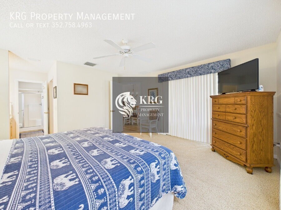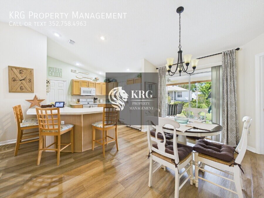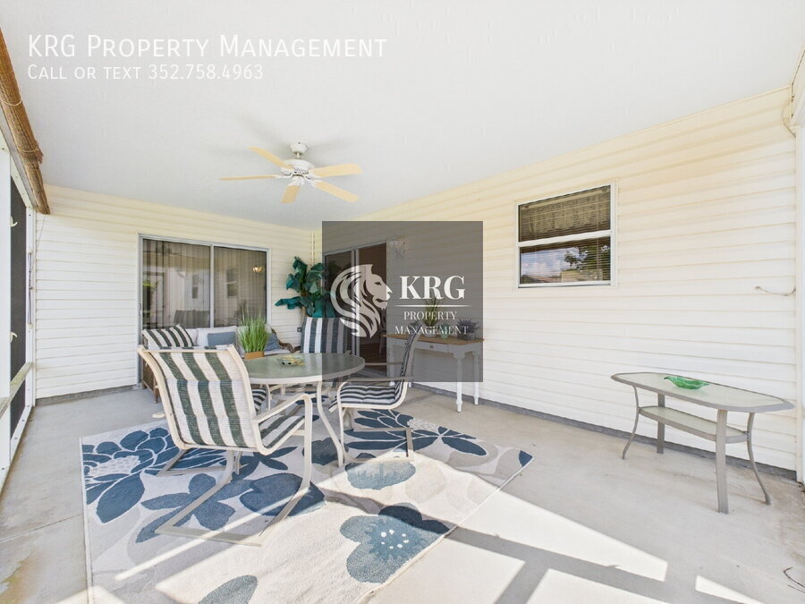 Enjoy the best of The Villages lifestyle in this charming and fully furnished 2-bedroom, 2-bath home, perfectly situated just minutes from both Spanish Springs and Lake Sumter Landing town squares. Inside, you’ll find an open and inviting layout with beautiful laminate flooring throughout the main living areas, creating a warm and low-maintenance space to relax and entertain. The spacious living room flows seamlessly into the dining area and fully equipped kitchen, making everyday living a breeze. The comfortable primary suite features an en-suite bath and generous closet space, while the second bedroom is ideal for guests or a home office. A screened-in patio porch offers the perfect spot for morning coffee or unwinding in the evenings while enjoying the Florida breeze. This home comes fully furnished with tasteful décor and even includes a golf cart so you can easily enjoy all the amenities The Villages has to offer, from golf courses and recreation centers to shopping, dining, and nightly entertainment. As a company, we do business in accordance with the Federal Fair Housing Law and welcome Persons of all Race, Color, Religion, Sex, Handicap, Familial Status or National Origin