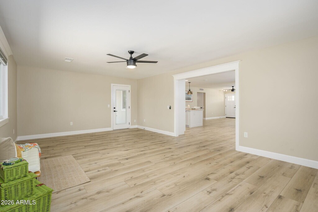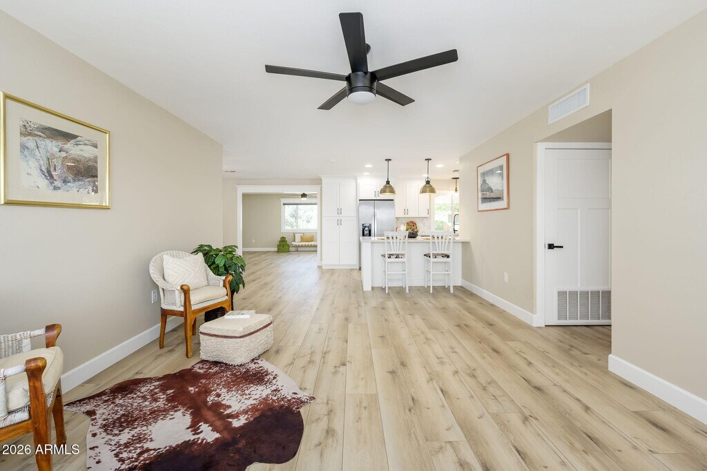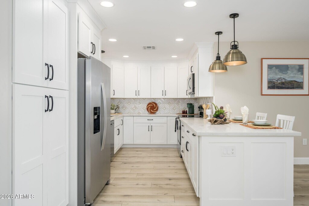 This beautifully remodeled Sun City homewinner of two Best of Tour awardsis now available for rent,offered either unfurnished or furnished upon request. The 3‑bed,2‑bath layout features a modern open floor plan with designer finishes,including a stunning kitchen with custom shaker soft‑close cabinetry,quartz countertops,bronze pendant lighting,a custom backsplash,and new stainless steel appliances. Both bathrooms have been fully renovated with luxury walk‑in tile showers.