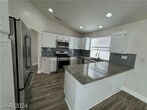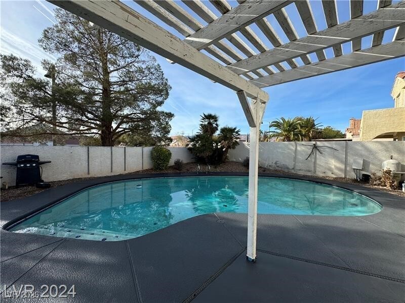 A beautifully remodeled single-story home located in the desirable Reflections at The Lakes community in Las Vegas. This residence offers 3 spacious bedrooms, 2 modern bathrooms, and a 2-car garage. The open floor plan is accentuated by vaulted ceilings and high-end vinyl plank flooring, creating a bright and airy atmosphere. The upgraded kitchen features a breakfast bar, granite countertops, glass tile backsplash, and stainless steel appliances, seamlessly flowing into the spacious living area. The master suite boasts a vaulted ceiling, private patio access, and a luxurious en-suite bathroom. Step outside to a beautifully landscaped yard with a covered patio, perfect for entertaining, and enjoy the private heated pool. This move-in-ready home combines modern upgrades with comfortable living in a prime location.
