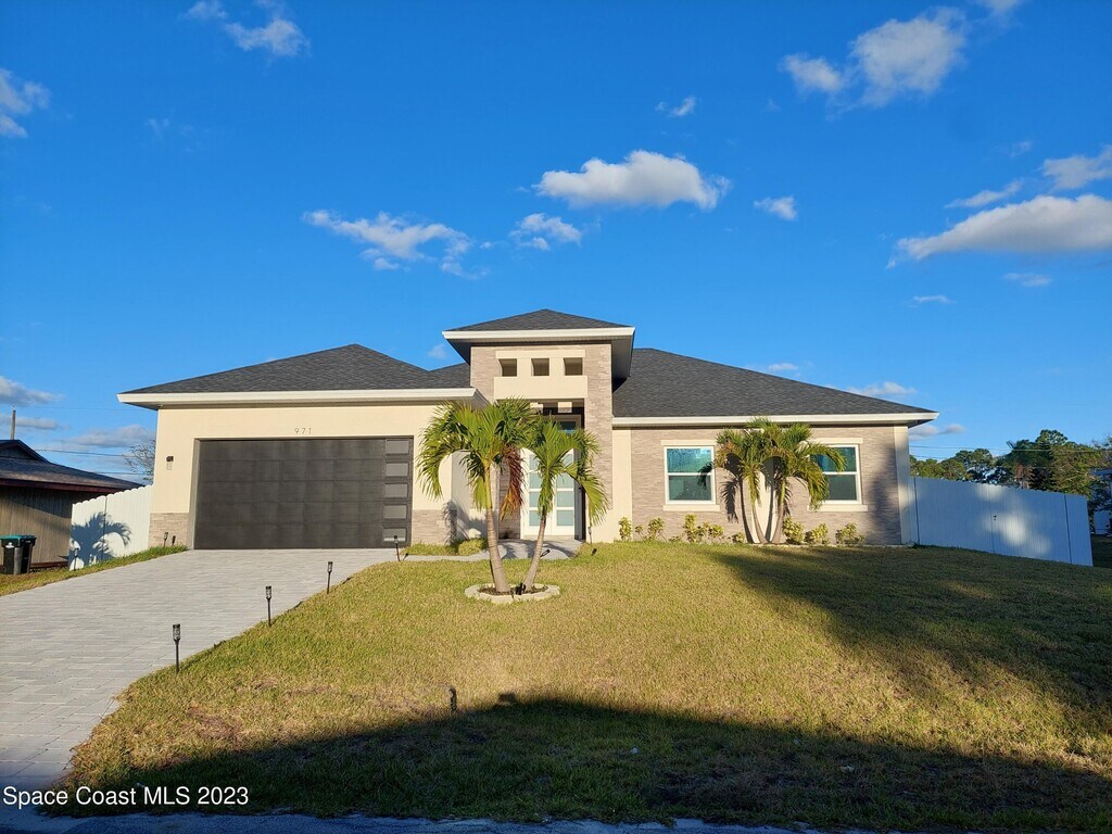 Available starting April 1,2026. Living in Palm Bay is Awesome! This wonderful and modern house with 4 bedrooms,2 bathrooms,and an internal garage for 2 cars,is waiting for you and your family,just one year old! Featuring a great room with vaulted ceilings and a designer accent wall with an open floor plan concept with its beautiful two-tone kitchen with a granite-topped waterfall island and large butler's pantry. The large master bedroom offers his and her closets in a split floor plan,with an en-suite bathroom that houses a modern floating tub and a walk-in shower,separate from the other 3 rooms offering added privacy. This gorgeous modern home offers plenty of storage for growing families and wonderful indoor/outdoor living with a large patio for entertaining and/or relaxing with a delicious family barbeque. MLS # 1071963