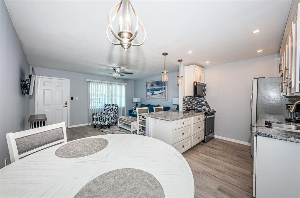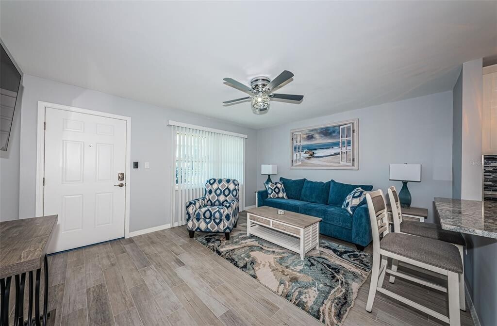 Beautifully updated and Fully Furnished condo just steps to the sand!! Treasure Island Getaway one block from the beach. One bedroom one bath condo on the first floor with assigned parking next to front door. Well designed Kitchen with custom cabinets and granite countertops,brand new appliances with Built in Microwave. Porcelain tile flooring throughout!! No steps to climb. Amenities include Water Front complex,Dock to fish or day park your boat,Block construction,Laundry room close to unit. Water,sewage,trash,included with rent. MLS# TB8396621