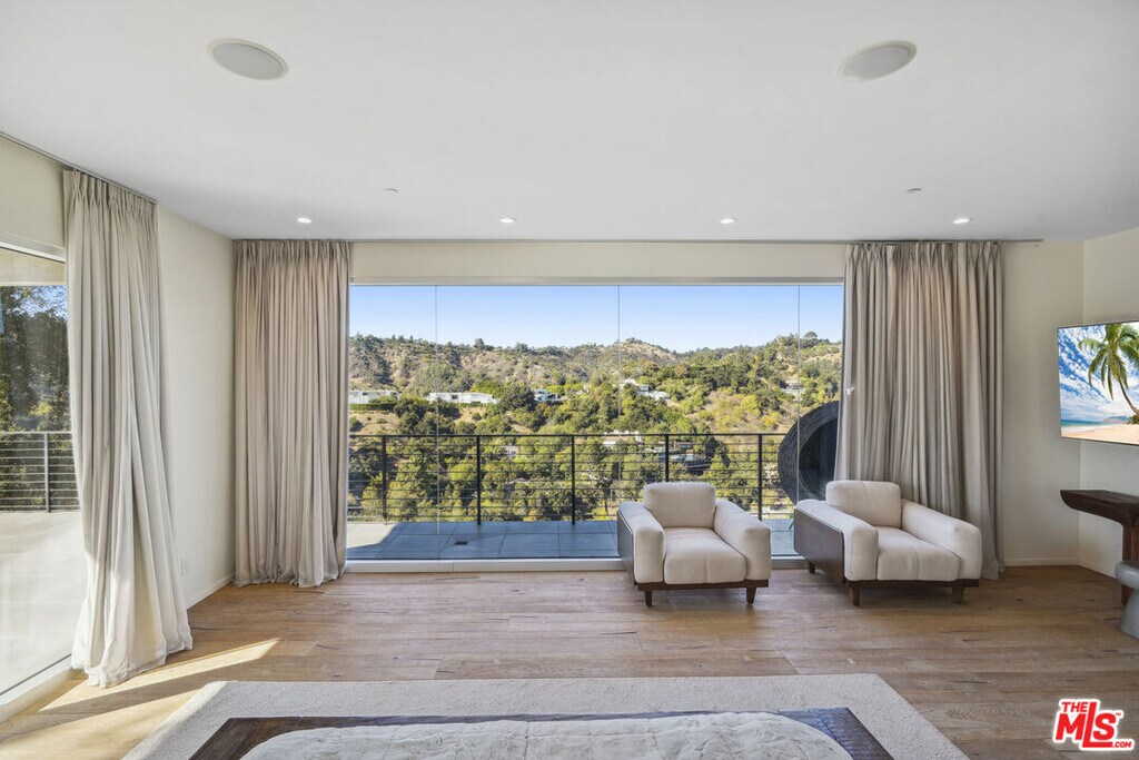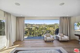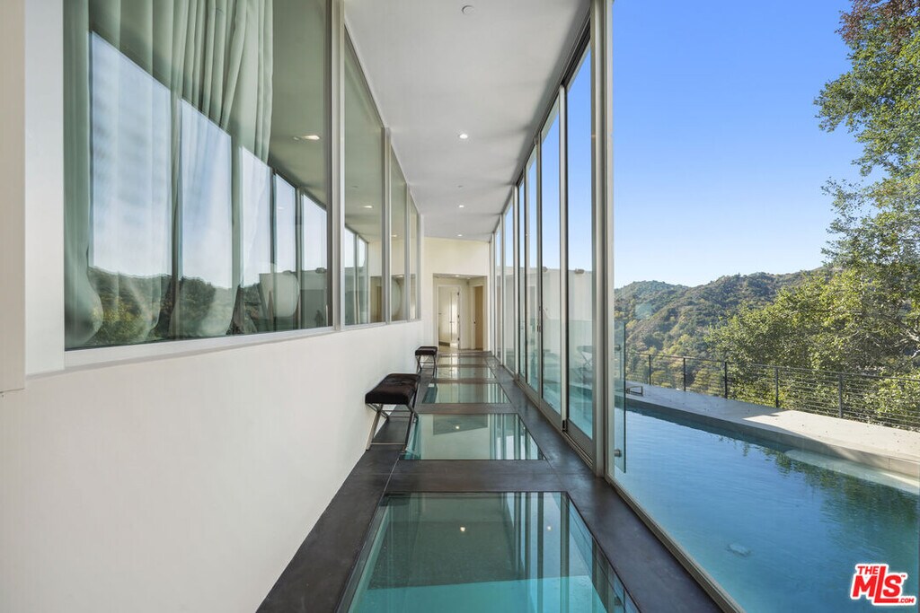 Suspended above the city within one of Beverly Hills' most exclusive, celebrity-favored gated enclaves, 9716 Oak Pass Road is a striking contemporary estate offering exceptional privacy, architectural distinction, and breathtaking panoramic views. The community is gated, and the residence itself is further secured behind its own private gate and drive, creating a rare and dramatic sense of arrival. Spanning approximately 6,244 square feet across three dramatic levels, this modern sanctuary is wrapped in walls of glass that capture canyon vistas from nearly every room, delivering a seamless indoor-outdoor lifestyle throughout. A signature architectural highlight is the glass-enclosed skybridge hallway suspended above the infinity-edge pool, serving as a sculptural centerpiece on the main level and elevating the home to true statement-level design. The residence offers a total of four bedrooms, including an expansive and private primary suite retreat with commanding views, oversized walk-in closets, and a spa-inspired bath. Three additional guest bedroom suites provide exceptional comfort and privacy. Designed for both refined daily living and elevated entertaining, the home features a gourmet chef's kitchen, sophisticated formal and informal living areas, a private executive office anchored by a dual-sided fireplace, and a dedicated private theatre/media room. Multiple view terraces and decks extend the living experience outdoors, while the floating infinity-edge pool appears to merge with the skyline, creating a resort-style setting high above Beverly Hills. Set among notable neighbors within an elite and discreet hillside enclave, this exceptional contemporary residence delivers a rare combination of privacy, prestige, and iconic architecture on one of Beverly Hills' most coveted streets. MLS# 26646419