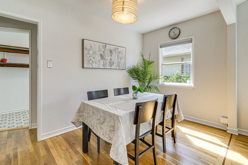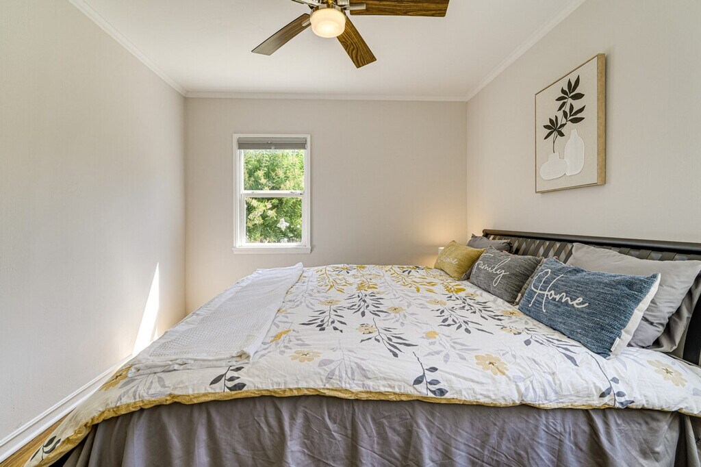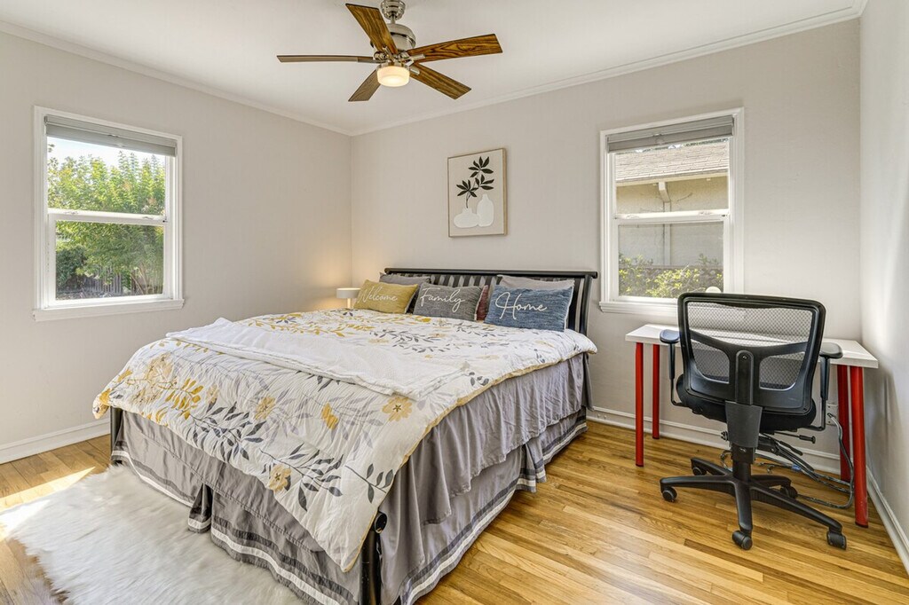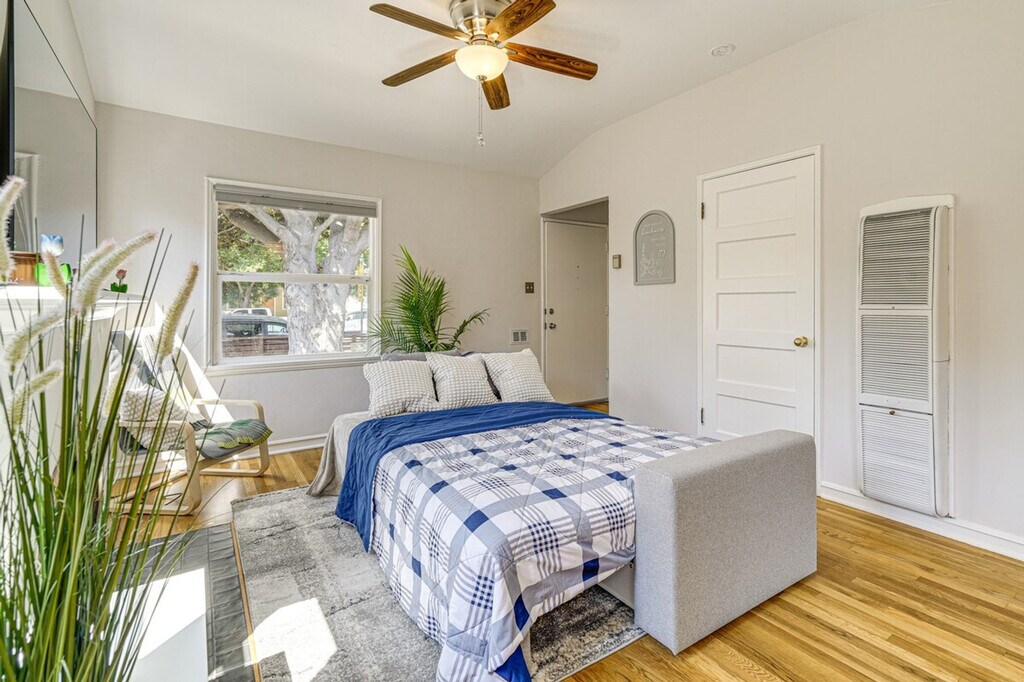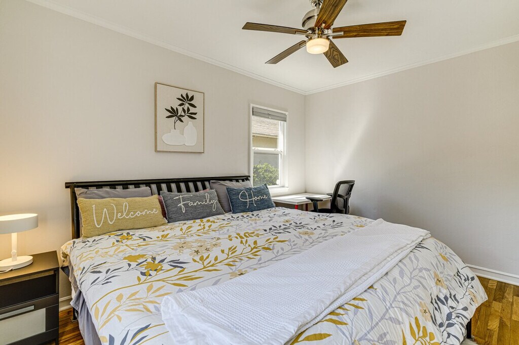 Your Silicon Valley hub awaits in this updated 1-bedroom, 1-bathroom duplex home, offering city convenience with private comfort. Perfect for business travelers, students, tech professionals, or couples, this property provides easy access to vibrant downtown San Jose hotspots like The Tech Interactive and San Jose McEnery Convention Center, all within a 1-mile radius. Enjoy effortless living in the Bay Area with off-street parking and remote work-friendly amenities. The apartment features a king-size bed in the bedroom and a full sleeper sofa in the living room. Enjoy home highlights such as a smart TV, a desk, and a private backyard. The kitchen is fully equipped with a refrigerator, stove/oven, drip coffee pot, electric kettle, toaster, cooking basics, dishware, and flatware. The property offers free WiFi and central heating. Parking is available in the driveway for one vehicle. Located in the heart of Silicon Valley, this home offers easy access to major interstates and is just a short distance from downtown San Jose. Explore nearby attractions and enjoy the convenience of city living while having a peaceful retreat to return to. The property requires three steps for entry and is a single-story duplex home. It features three exterior security cameras facing outwards for your safety. Smoking, pets, and events or large gatherings are not allowed. Guests must be at least 25 years old to book. Additional fees and taxes may apply, and a photo ID may be required upon check-in. The property does not have air conditioning, but ceiling fans are available for cooling. The apartment is remote work-friendly, featuring a desk and complimentary WiFi, making it ideal for business travelers and tech professionals. [SI]