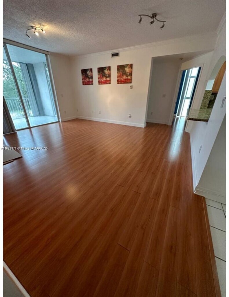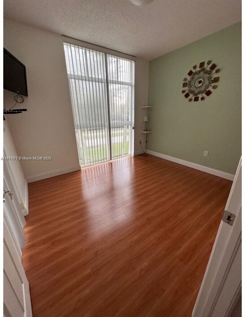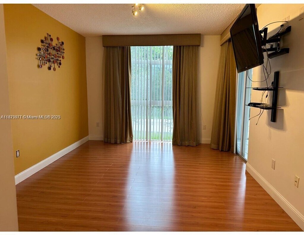 Courtesy of Fortex Realty Inc Posted by Andrew Coleman with EXP Realty Amazing corner unit in the heart of Doral, close to shopping centers, banks, Citi of Doral, ClubHouse, with Pool, Jacuzzi, sauna, Gym, tennis court, pickleball court, schools, it has curtains, 3 bedrooms, 2 full bathrooms, all renovated, new kitchen, wood floor, Master has a TV with control and curtains, with walking closet plus additional closet. Second and third bedrooms have 1 TV with control, 6 stools, some pictures on the walls, Multiple closets, Washer and Dryer inside. Bathroom with Jacuzzi, screen balcony, 2 parking spaces, plenty of parking for visitors, NO PETS, price includes water, garbage, sewer and association duties.