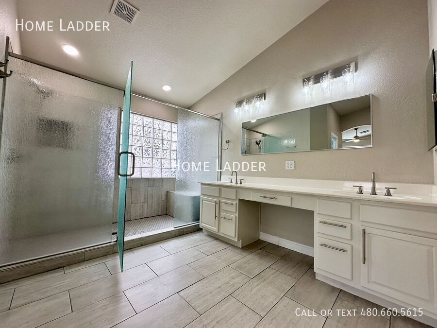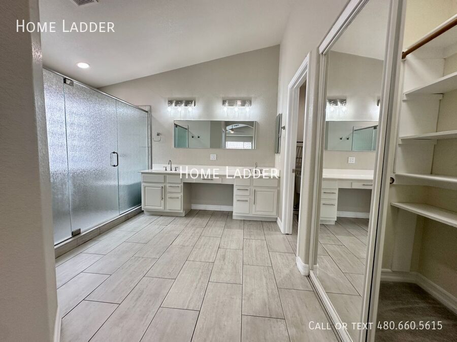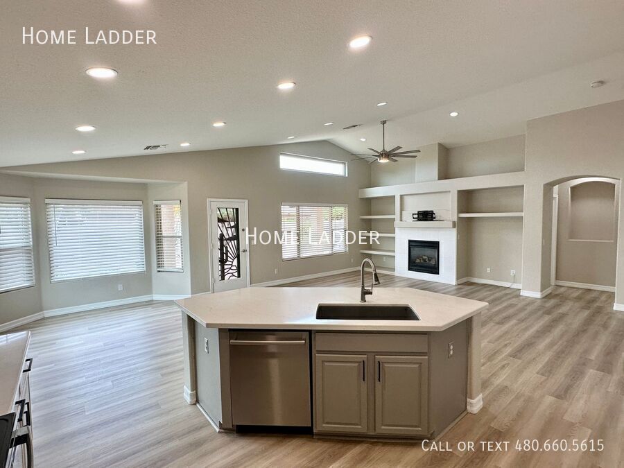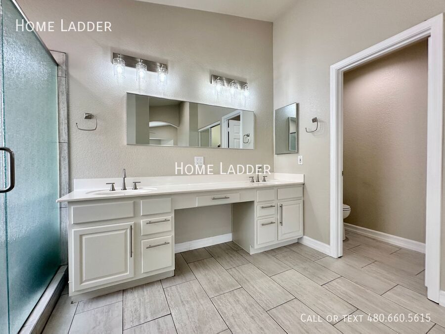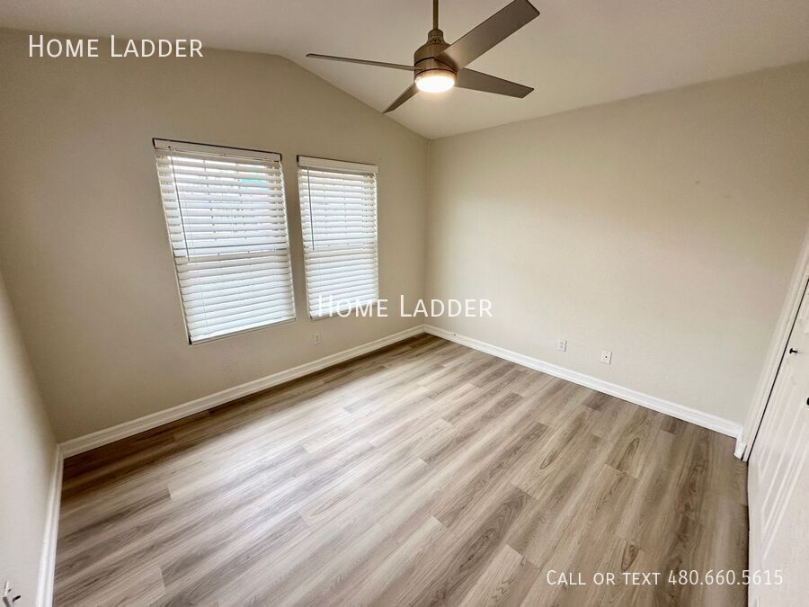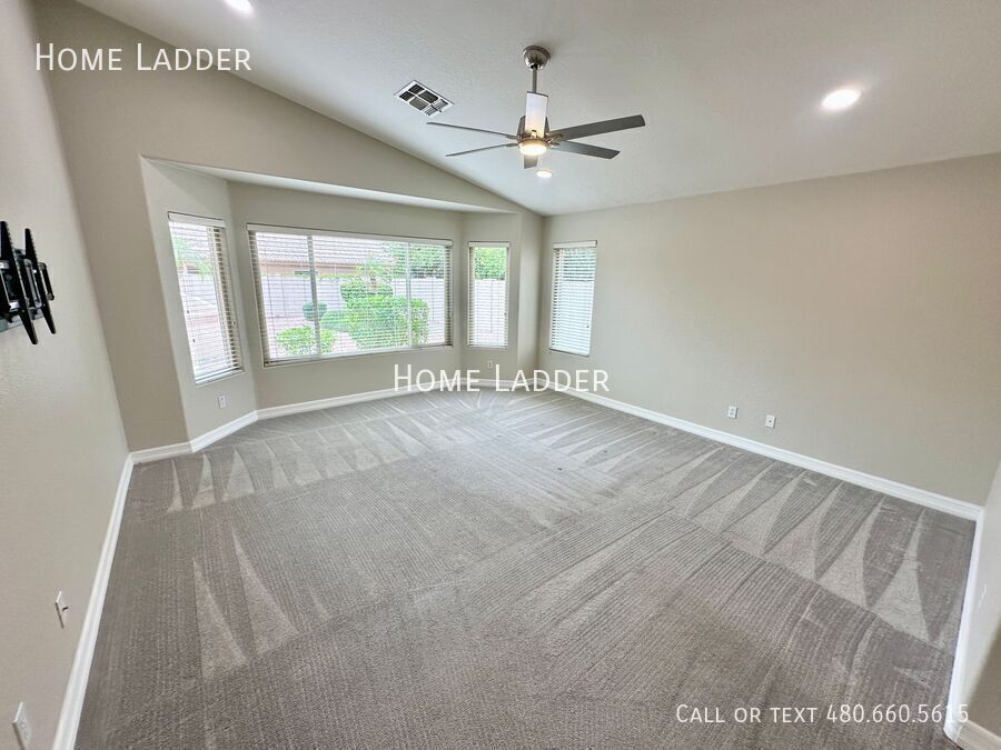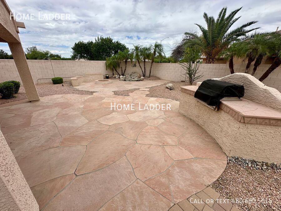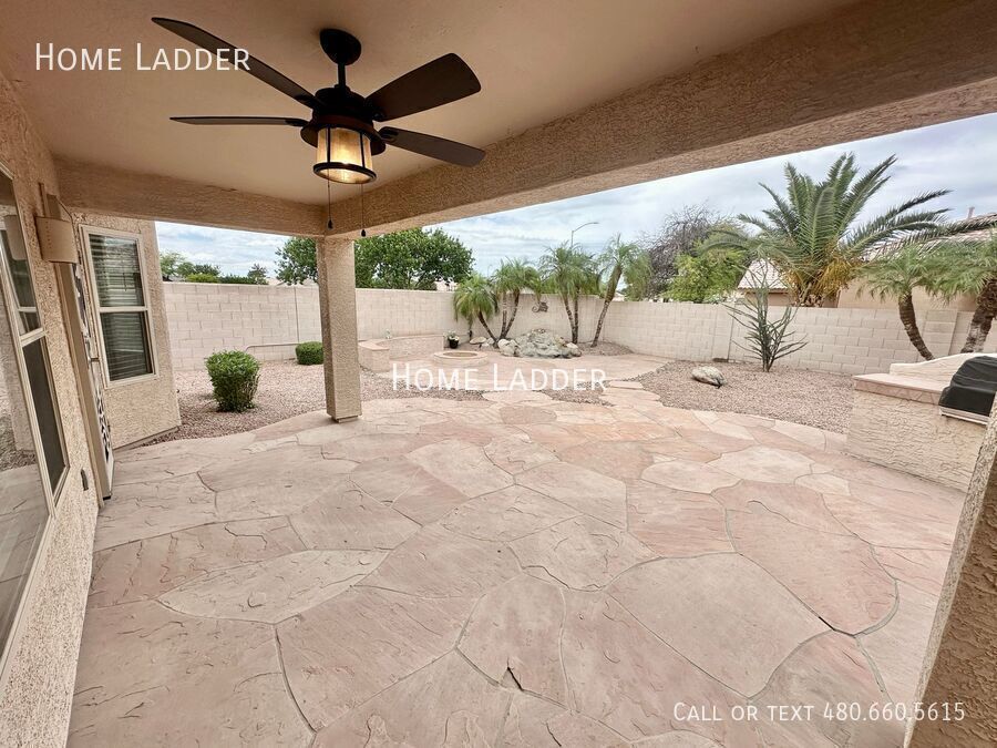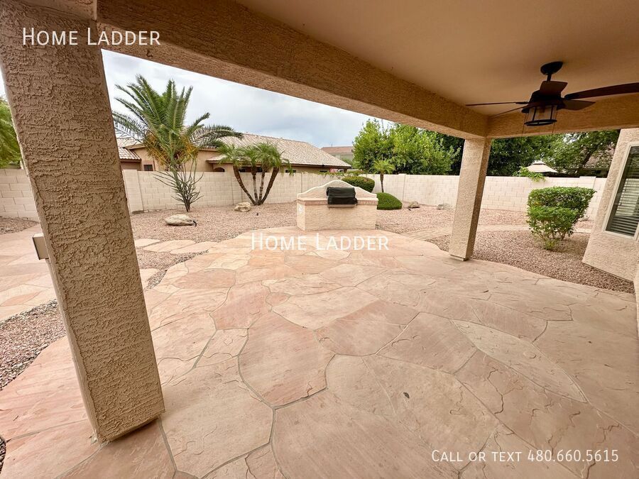 Welcome to this beautifully updated 3 bedroom 2 bath home located on a desirable corner lot in the Augusta Ranch community. This home features an open-concept great room with a cozy gas fireplace and an abundance of natural light creating a warm and inviting space. The thoughtfully designed split floor plan offers added privacy, with luxury vinyl plank flooring throughout the main living areas and plush carpeting in the bedrooms. The stunning kitchen is a standout, featuring a large island, white quartz countertops, and a stylish backsplash with stainless steel appliances all included and a large pantry. The spacious primary suite includes bay windows, dual closets, and a spacious en suite complete with dual sinks, a large tiled walk in shower with dual shower heads, and a separate toilet room. Step outside to enjoy a backyard designed for comfort and entertainment. The covered patio is complete with flagstone, built-in gas fire pit, and a built in barbecue grill create the perfect setting for outdoor living. Mature landscaping, accent lighting, and a tranquil pond with a cascading waterfall add to the peaceful ambiance. Additional features include a widened driveway with pavers, a garage with epoxy flooring and storage shelving, a designated laundry room with washer and dryer hook ups and security doors with built-in screens for added comfort. Conveniently located near community amenities including a park, greenbelt, basketball court, and playground. And quick access to US 60 and Loop 202. All Home Ladder residents are enrolled in the Resident Benefits Package (RBP) for $50/month, which includes renters insurance, credit building to help boost your credit score with timely rent payments, $1M Identity Protection, HVAC air filter delivery, our best-in-class resident rewards program, and much more! More details upon application. Additional monthly fees: $9 admin, $35 pet rent/pet. This property qualifies for our security deposit alternative—move in with less upfront cost! One-time fees: $49 application fee per adult, $149 pet application per pet, $195 administration, and a security deposit equal to one month’s rent. 12-18 month minimum lease term. If moving in between 7/1 and 01/31, the lease term shall be 18 months. If moving in between 2/1 and 6/30, the lease term shall be 12 months. Lease must commence within 21 days of application approval. After approval, security deposit must be delivered to our office by noon on the next business day. The lease must start Monday-Thursday and not on any federal/state holidays. Single Level