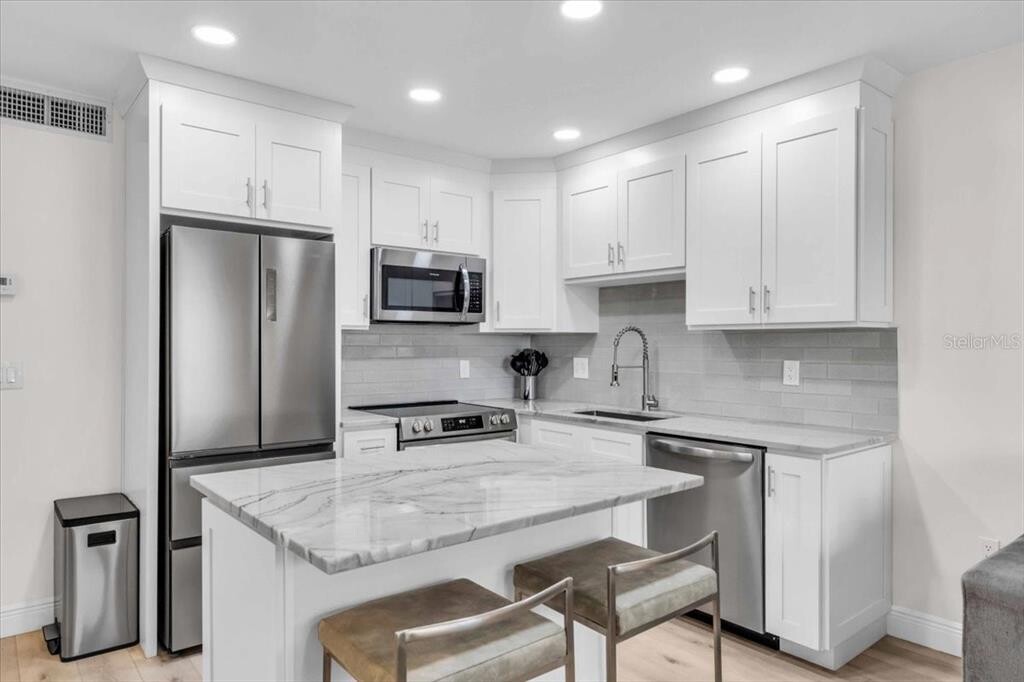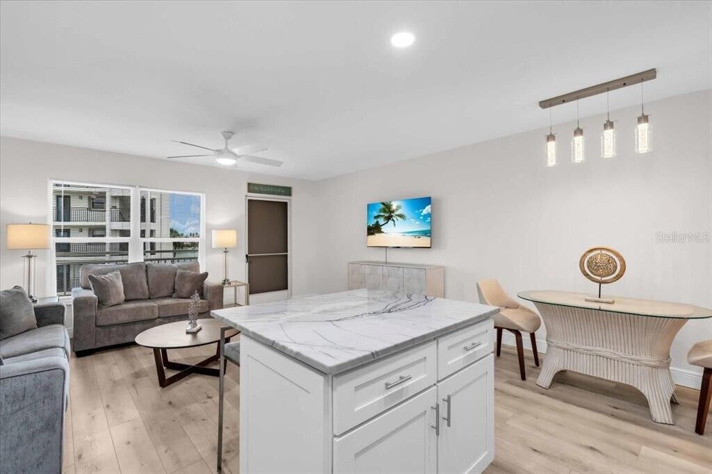 Step into this completely renovated and fully furnished 1-bedroom,1-bath condo just steps from world-famous Sunset Beach. Designed with style and comfort in mind,this beachside gem features high-end stainless steel appliances,elegant quartz countertops,and a designer bathroom with stunning custom tilework. The open-concept layout leads to a private balcony where you can enjoy warm Gulf breezes and tranquil vibes. Tucked between the Gulf and Intracoastal,the community offers a sparkling pool,dock access,laundry facilities,and available covered parking. All utilities are included except electric. With walkable access to beach bars,dining,and live music,and just minutes to downtown St. Pete and John's Pass,this turnkey retreat delivers the best of Treasure Island living. MLS# TB8482192