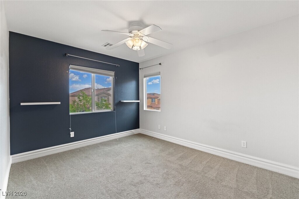 Discover a home that blends luxury, efficiency, & convenience! Equipped w/solar panels, energy bill under $20 per month, while a backup battery system ensures uninterrupted power. Open-concept layout featuring a modern kitchen w/stainless steel appliances, granite countertops, a stylish backsplash, & a breakfast bar ideal for casual dining & entertaining. The elegance continues w/Italian porcelain flooring downstairs, & soundproofing between stories for added comfort. The insulated garage door enhances energy efficiency & is designed for secure Amazon deliveries. Additional upgrades include a new hot water system w/a circulator, a water softener, attic insulation,& full blackout shades in every bedroom. Outside, relax in a beautifully landscaped yard featuring lush greenery, a charming paver patio perfect for seating, & vibrant fruit trees. Conveniently located just minutes from top dining, IKEA, Summerlin, & more this home is a rare find offering style, sustainability, prime location!