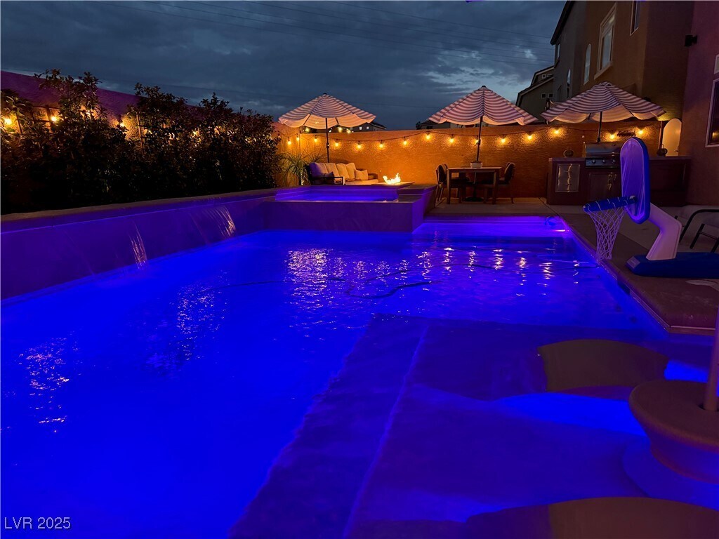 Stunning fully furnished 3-bedroom, 3.5-bath residence with a 2-car garage converted into a game room (option to revert back). This home offers a beautiful private desert oasis featuring a sparkling saltwater pool and spa with waterfall, fire pit, and built-in BBQ kitchen. Inside, enjoy elegant flooring throughout, and an open family room filled with natural light. The chef’s gourmet kitchen boasts a lovely garden window, Sub-Zero refrigerator, stainless steel appliances and custom built pantry. The primary suite captures breathtaking city and Strip views and includes a fabulous designer-built custom closet. A spacious junior suite adds to the home’s appeal. Perfectly situated near premier schools, upscale shopping, freeway access, Allegiant Stadium, the Las Vegas Strip, and the airport—this residence beautifully blends elegance with convenience. Rent includes professional pool service and landscaping for a relaxing, worry-free lifestyle!