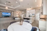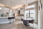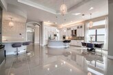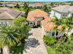 Beautiful and alluring lake views from this upgraded single-story home featuring 4 bedrooms and 3.5 bathrooms, with impact glass throughout. Highlights include coffered ceilings, crown moldings, a custom media center, built-in closets, a full home generator, and whole-house water filtration and purification. The chef's kitchen boasts quartz countertops, a gas range, and premium appliances. The primary suite has custom closets, European-style drapes, and a spa-like bathroom with dual vanities, a large shower, and a bidet. Relax by the heated pool or enjoy the summer kitchen and upgraded picture window screen enclosure. Marble-look tile, an EV car wall charger, and a 3-car garage complete the property. Seven Bridges offers an unparalleled lifestyle with its 30,000 sq ft clubhouse, modern