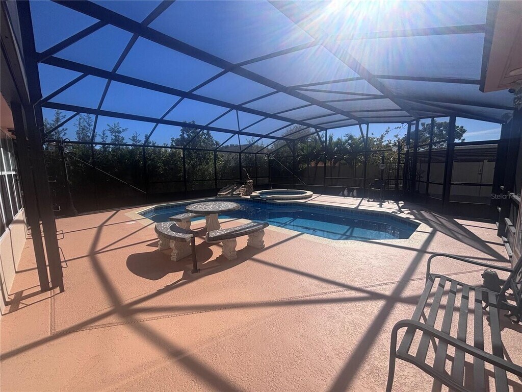 This 4 bedroom 2.5 bathroom pool home is located in the growing Poinciana area. Centrally located to shopping, dining, medical and so much more!! Not your typical rental home. This home has been upgraded to the max! The whole house is ceramic tiled with no carpeting. The kitchen is a chefs dream come true with granite counters, solid wood cabinets including a wine rack, upgraded stainless steel appliances, an island and a breakfast bar. Flex space for living, dining, family room and/or office. The back porch is enclosed with a fully functional wet bar. The pool area is expansive with a water fall, jacuzzi and outdoor shower. No expense has been spared here! Quite a deal for a large family to enjoy the joys of entertaining. The yard is completely fenced with metal fencing and white vinyl fences. The camera's will be deactivated for the front house and there will be no access to the back house which is accessed through a different driveway. Completely private even comes with an electric car charger. Don't miss out on this one!