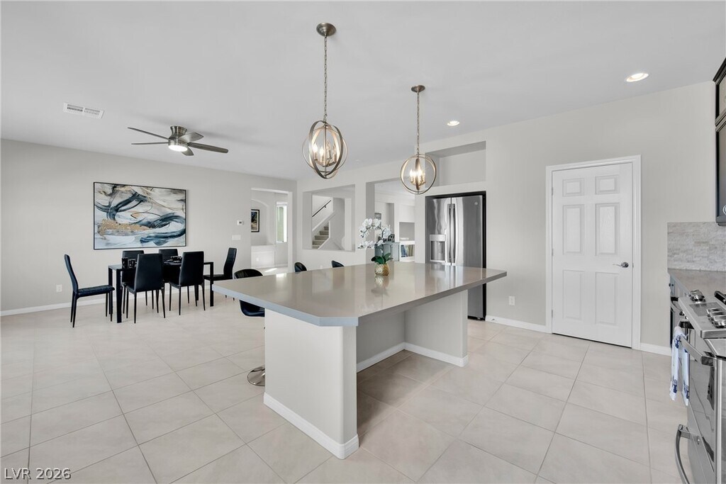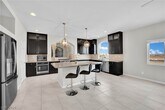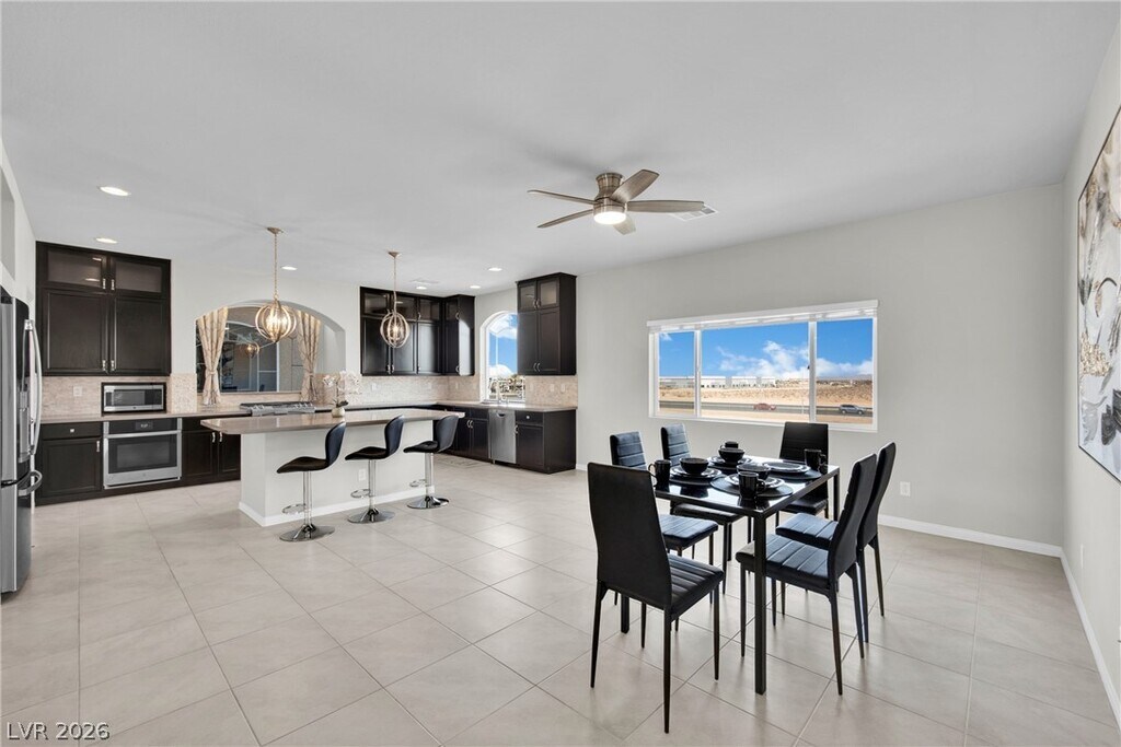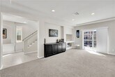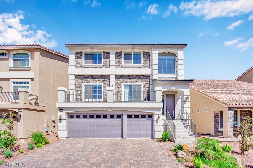 Beautiful 5-bedroom home with solar, offering an average energy bill of about $12- $20 per month (Can vary depending on usage). Conveniently located approximately 15 minutes from the Las Vegas Strip and Allegiant Stadium. This upgraded home features GE appliances, a gourmet kitchen with dual ovens, stone backsplash, custom windows, and a large quartz island with matching countertops. The spacious great room includes a modern LED fireplace and access to a large balcony with city and mountain views. The primary suite offers a spa-style walk-in shower with dual showerheads and two walk-in closets. Every bedroom includes a walk-in closet. A second primary suite downstairs includes a family room that opens to a fully landscaped yard with built-in BBQ, perfect for entertaining. Additional highlights include ample storage, a spacious 3-car garage, and low HOA. Note: Photos are from prior staging. Home is currently unfurnished.