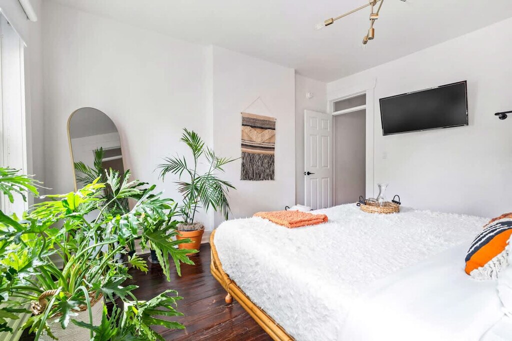 Feel at home in this centrally located 2-bedroom apartment in Columbus, Ohio. The apartment features original hardwood floors and upscale decor. This apartment is filled with gorgeous rare plants, and it features a fully equipped kitchen with quartz countertops, high-speed internet, and three Smart TVs with streaming apps. For your convenience, there is also a hair dryer, handheld steamer, and dryer. The apartment also includes tower fans and white noise machines. Pets are welcome for a fee of $40 per pet per night. Street permit parking is available for one vehicle. The location is perfect for exploring Columbus. The Short North District and the Greater Columbus Convention Center are both a 5-minute walk away, and the Nationwide Arena Stadium is a 10-minute walk away. You'll find many great restaurants and bars on North High Street, and it's less than a mile to the Kroger Food Market, downtown Columbus, and Ohio State University campus. The Nationwide Children's Hospital is an 8-minute drive, and CMH Columbus John Glenn Airport is a 10-minute drive. Some city or neighbor noise is possible due to the central downtown location and shared wall with the neighboring unit. Quiet hours are from 9 p.m. to 7 a.m. Breaking any house rule will result in a charge of $500. Absolutely no plants in the home are to be moved for any reason. No loud music is allowed at any time. No parties, small gatherings, or events are allowed. No smoking, marijuana, firearms, illegal substances, or any illegal activity are allowed on the property. No additional unregistered guests are allowed. Tampering with exterior surveillance, noise monitors, and smoke sensors will lead to immediate cancellation with no refund, as well as a $300 violation charge. Any late check-out will result in an additional charge of $100. Registration Number: 20232029 [SI]