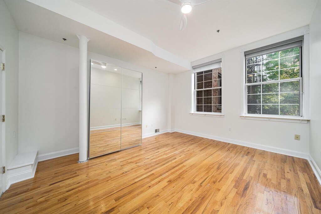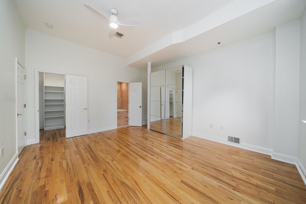 Rarely available condo rental on Park and First, available May 15. This nearly 1200 sqft, 1 bed, 2 full bath, south-facing, stunning condo offers the best of Hoboken living: proximity to PATH, restaurants, and shopping. Oversize master bedroom fits a king size bed, plus twin bed or cribs, or a row of wardrobes. Tons of charm: 10+ ft ceilings, gleaming hardwood floors, blinds, and working wood fireplace, yet all the modern conveniences like central A/C, elevator, stainless kitchen appliances, LED recessed lighting, modern ceiling fans, in-unit laundry, walk-in closet in master suite, double hall closets and two full baths. Master bath has double vanity and deep Jacuzzi tub. Professionally managed boutique elevator building with common roof deck with NYC views. Building entrance has video intercom/virtual doorman for convenient package delivery. Walk to PATH and the best of Washington St shopping and restaurants in 5 minutes. Additional free storage available in lobby. Rental parking available at 77 Park. 12 month minimum lease. 1.5 month security deposit. Sorry, no smokers, no pets, no exceptions.