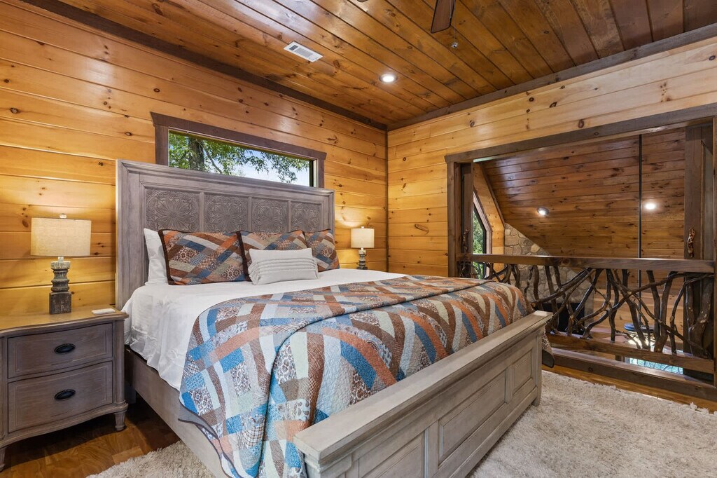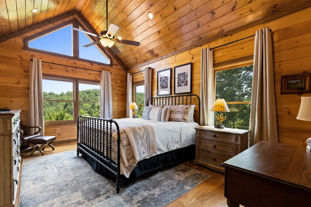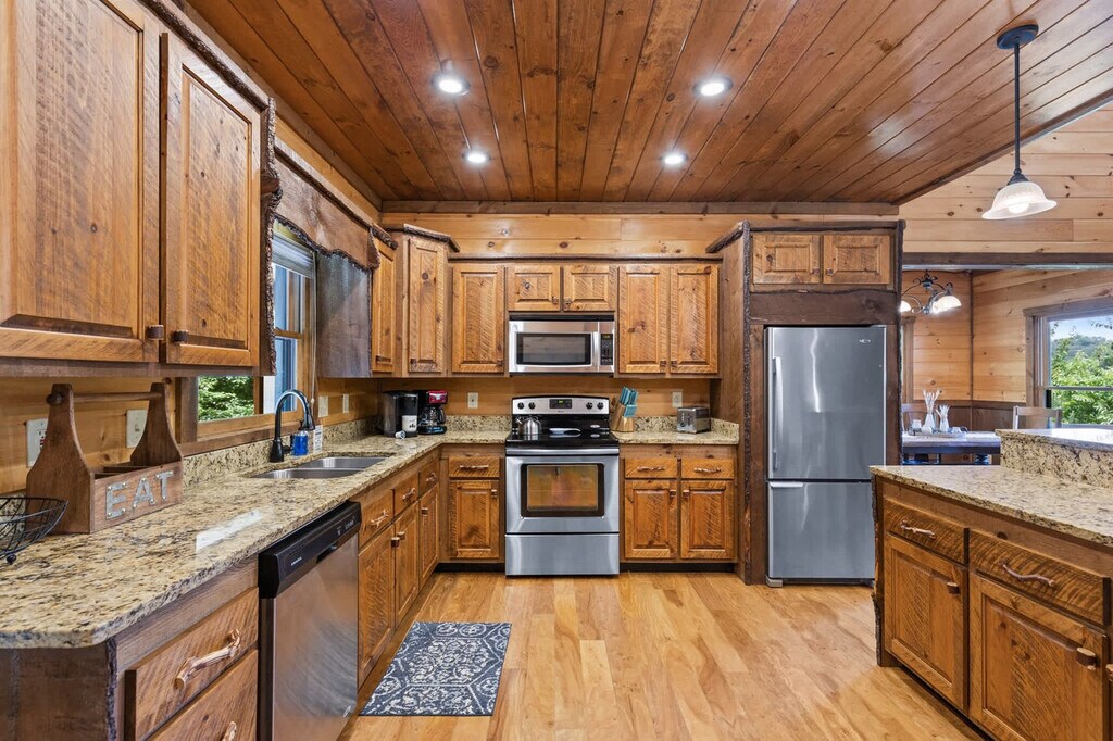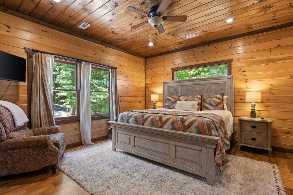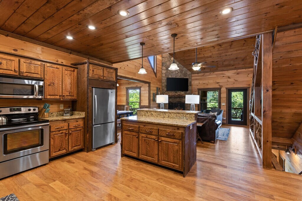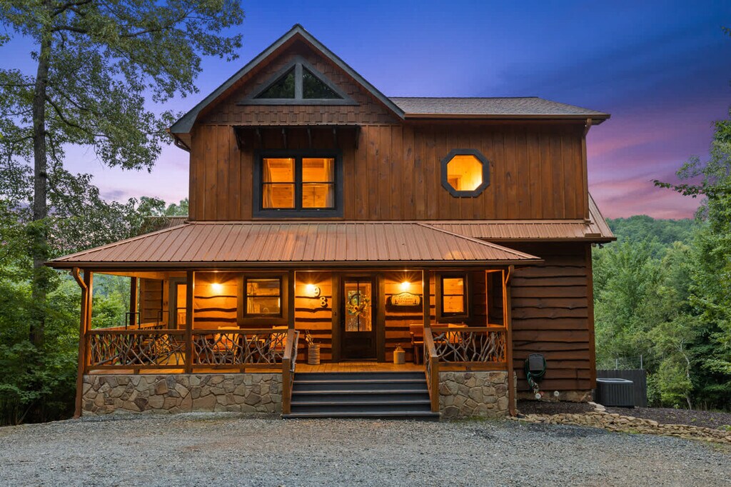 This 4-bedroom cabin in Blue Ridge, GA, offers everything you need for an amazing vacation. With an expansive deck boasting stunning views, this cabin is designed for relaxation and enjoyment. Feel at home in this serene mountain escape, featuring a hot tub, fire pit, outdoor patio and dining area, BBQ grill, and ample parking. Inside, you'll find a game room with a bar and whiskey barrel gaming, a fully stocked kitchen, TVs in each bedroom, and cozy indoor spaces with fireplaces. Welcome to EZ Come EZ Geaux, your spacious 3-level cabin retreat with 4 bedrooms and 3.5 bathrooms, comfortably accommodating up to 10 guests. This charming cabin combines rustic elegance with modern comfort, featuring an open-concept layout, soaring ceilings, and cozy gathering spaces. Whether you're unwinding by the fire, enjoying movie nights, or sipping coffee on the deck while soaking in mountain views, this home is your perfect base for exploring Blue Ridge. Up to 2 dogs are allowed for $125 per stay, but no cats please. We kindly ask that your dog is crate trained and that you pick up after your dog. Parking is available in the driveway for up to 5 cars. Nestled in nature, this cabin is ideally located for exploring Blue Ridge and its surroundings. Nearby attractions include Mercier Orchards, Blue Ridge Scenic Railway, Long Creek Falls, Lake Blue Ridge Marina, and Chattahoochee National Forest Trails, all within a short drive. Enjoy dining at local restaurants like Black Sheep Restaurant and Bar, Harvest on Main, and Cucina Rustica, all just a 10-minute drive away. Renting a car or using rideshare services like Uber and Lyft are convenient options for getting around. Guests must be 21 years or older to book this property. Check-in is at 4pm and check-out is at 10am. No parties are allowed, and violations may result in immediate termination of the stay. Quiet hours are from 10:00 PM to 8:00 AM daily, and overnight street parking is not permitted per the community covenants. A non-refundable $60 damage waiver is required, covering accidental damage during your stay, provided it is reported before check-out. [SI]