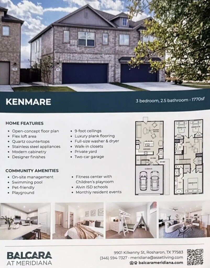 Welcome to the highly sought-after Built-To-Rent community in Meridiana,perfectly located at the front of the neighborhood with easy access to Hwy 288,shopping,dining,and everyday conveniences. This stunning Kenmare floor plan offers 3 bedrooms,2.5 bathrooms,and a thoughtfully designed open-concept layout that blends comfort,style,and functionality. This home also includes a full-size washer and dryer,two-car garage,and a private yard,giving you the space and convenience of a home with the ease of a professionally managed community. Residents enjoy resort-style amenities including a community pool,fitness center,playground,and beautifully maintained green spaces,along with access to top-rated Alvin ISD schools. Located just a shot walk from Starbucks,restaurants,and retail,this home offers the perfect balance of lifestyle and location. Experience low-maintenance living without sacrificing space or style—welcome home to Meridiana living at its finest. MLS# 67200545