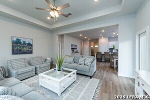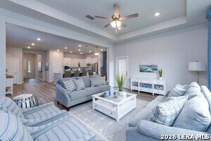 Welcome to your Joseph Creek Homes home in Rhine Valley, Schertz, Texas! Discover luxury touches throughout this spacious 2115 square foot, 3 bedroom, 2 bath home. Enjoy the convenience of a two-car garage. Inside, upgrade your style with the decorator color selections, Brushed Nickel hardware and Brushed Nickel plumbing fixtures, adding a touch of sophistication to every room. This home features 42 Upper cabinets in the kitchen complete with a huge island,cook top and built in appliances. The bright and open floor plan has luxury vinyl plank throughout the primary living areas, tile in the baths and lush carpet in the bedrooms."