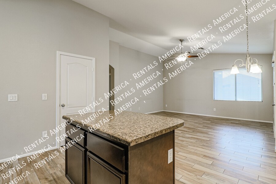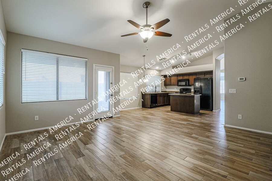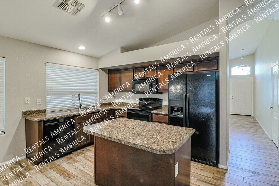 1/2 OFF 1st Full Month's Rent if Move In by Nov 30th! Beautiful open layout formal living / kitchen at entry leads to kitchen, then family room with side access to back yard. Kitchen features island w/ breakfast bar, all black appliances, built-in microwave rich, dark cabinetry and dining area. Large family room w/ side access to functional back yard with a covered paver patio, open paver patio w/ firepit and bordered grass area. Owner suite includes spacious bedroom, walk-in closet, double sink vanity, garden tub, walk-in shower and back patio access. Attractive plank tile in all livable areas. Carpet in all bedrooms. Vaulted ceilings, recessed lighting, updated fixtures and ceiling fans throughout. Minor repairs scheduled. One Time Admin Fee: $300, Pet Deposit: $300/pet (If applicable), Rental Service Fee: 2%. Resident Benefits Package: $39/month. Helping Heroes Discount Available! Dryer Pets Allowed Washer