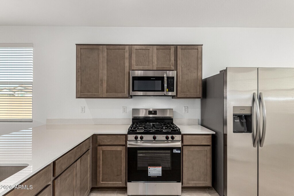 Be the first to live in this brand-new Bisbee model in Western Garden! This modern 3-bed,2-bath offers an open,airy layout with mocha cabinets,white marble countertops,an eat-in kitchen plus breakfast bar,pantry,and all stainless-steel Frigidaire appliancesincluding a gas stove. Washer and dryer are also included for easy move-in. The primary suite features a spacious walk-in closet and a beautifully upgraded bath with a large walk-in shower and dual sinks. Enjoy the privacy of a split floorplan,EV-ready garage,and endless hot water,thanks to the tankless gas heater. Gorgeous mountain views complete the setting! Western Garden residents get access to top-notch amenities: community pool,pickleball courts,playgrounds,and more. You're just minutes from State Farm Stadium,Westgate Entertainment District,Wildlife World Zoo,and a variety of local attractions. A fantastic blend of comfort,convenience,and lifestyle! Turf,pavers & desert landscaping to be added in the backyard. Tenant may need to cooperate with landscapers after move-in.