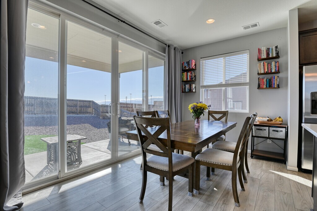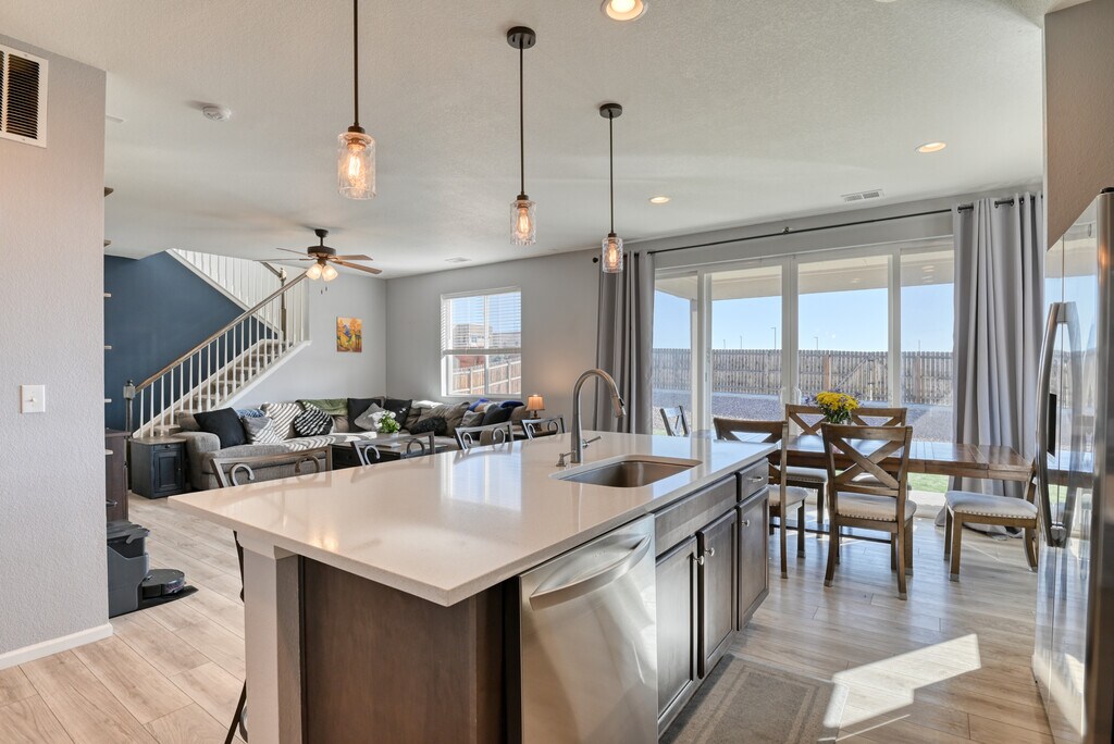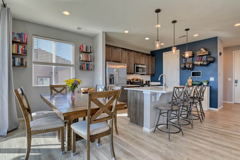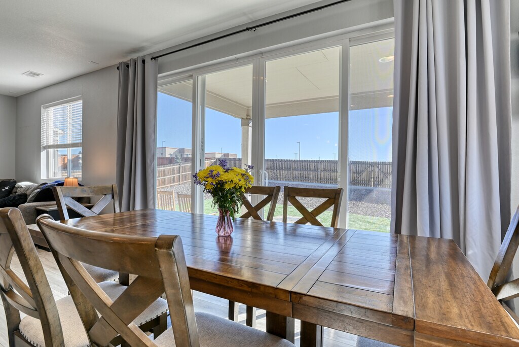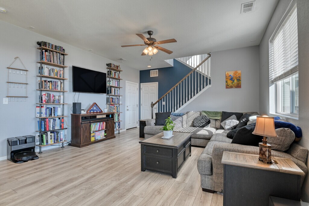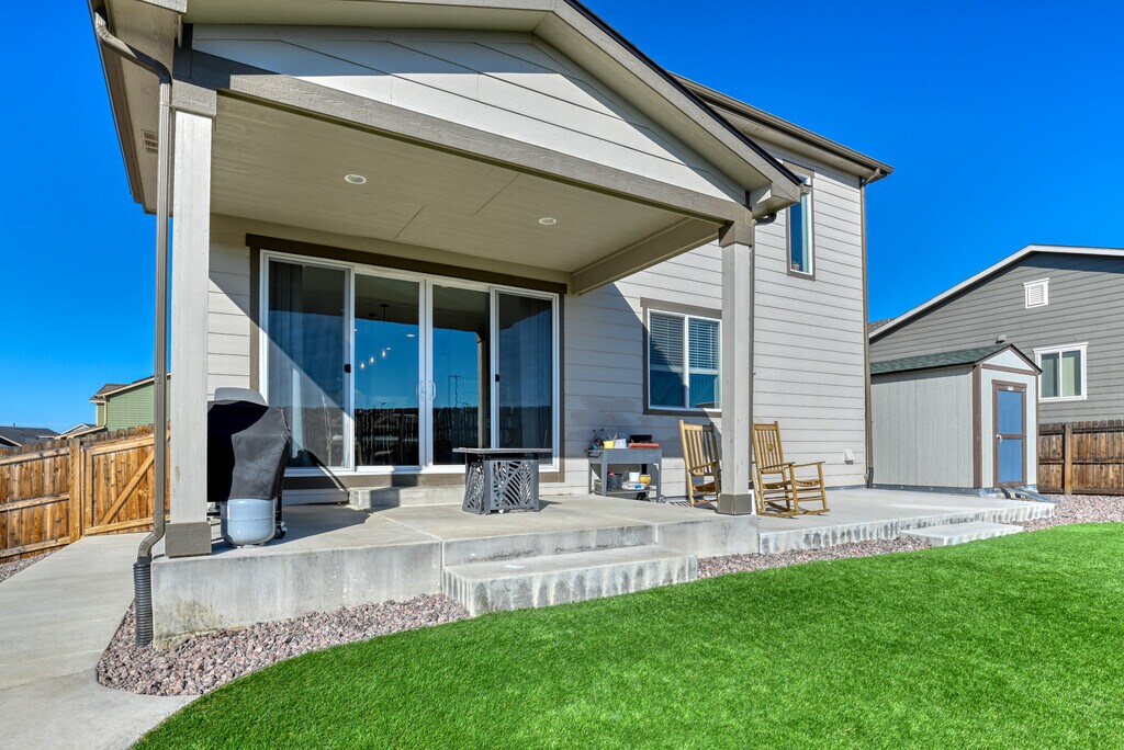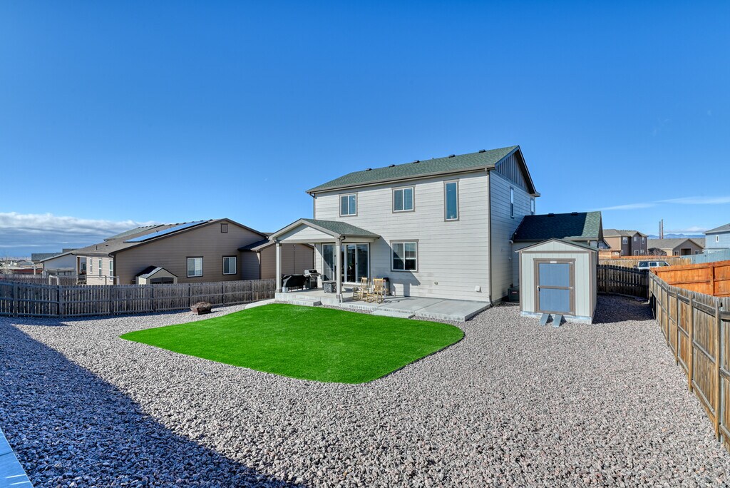 This stunning Paint Brush Hills 3-bedroom, 2.5-bathroom residence offers modern, low-maintenance living with an inviting open-concept layout perfect for entertaining. The main level flows seamlessly from a bright living area into a chef's kitchen featuring a gas stove, sleek stainless steel appliances, and ample cabinetry—ideal for home-cooked meals and gatherings. Upstairs, discover a versatile loft space that adds flexible square footage—use it as a cozy family retreat, home office, play area, or additional seating zone. Outside, enjoy true Colorado turn-key convenience with beautifully xeriscaped front and back yards designed for minimal upkeep. The property includes a spacious 3-car garage for vehicles, hobbies, or extra storage, plus an additional backyard shed for tools and gear. A convenient backyard gate provides easy access, enhancing functionality for daily routines or play. This home is within easy walking distance to top-rated schools in Falcon School District 49, including Bennett Ranch Elementary and Falcon Middle School.