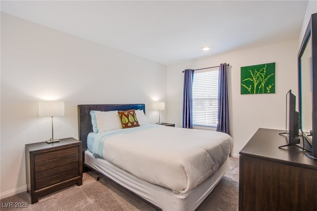 Tucked away in the Southwest Las Vegas valley is this 5 bedroom/3 bath home that offers a seamless blend of comfort and convenience. With open living areas that are inviting and functional. Kitchen has a spacious pantry, plenty of cabinet space and breakfast bar overlooking the living room. Tile flooring throughout the main level and plush carpet in the bedrooms. Perfect for multigen families with a full bedroom and bathroom downstairs. Primary suite has not one, but two large walk-in closets and ensuite bathroom. Ideally located just minutes from the 215 Beltway, outdoor recreation, local shopping and nearby schools.