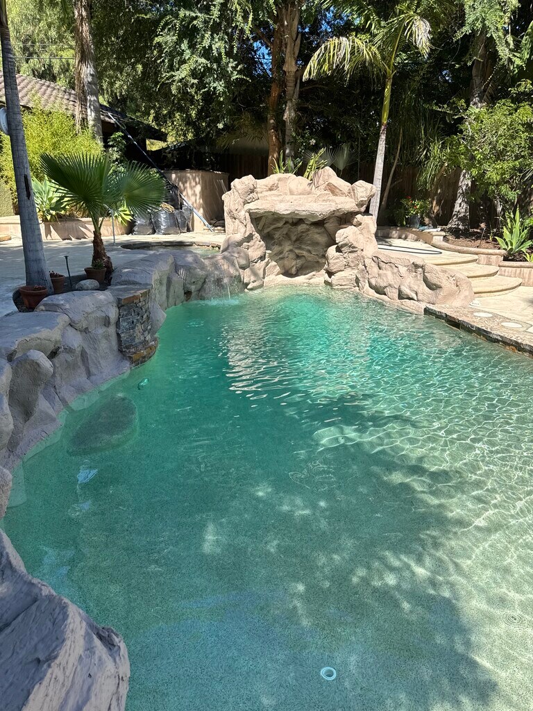 A private and tropical oasis in the heart of the Valley (Lake View Terrace), walking distance to the Golf Course. Nearly 1 acre property completely redone with beach entrance heated pool, jacuzzi, built-in outdoor grilling area and built-in natural gas fire pit. Large Beautiful home with 3 bedrooms, 3 full bathrooms, two separate dining areas, a large living room, large and spacious bedrooms, a fire place, a detached patio and a detached two-car garage. All appliances included! Large flat area to park trucks, cars, boats, recreational vehicles, etc . Plenty of space indoors and out! The property has two single family homes but they are far apart. Both are available at the moment (other house is a large 2 Bed 2 Bath) Price includes Water Utilities, Gas Utilities, Weekly Pool Maintenance and Weekly Gardening Services. Please text me if interested.