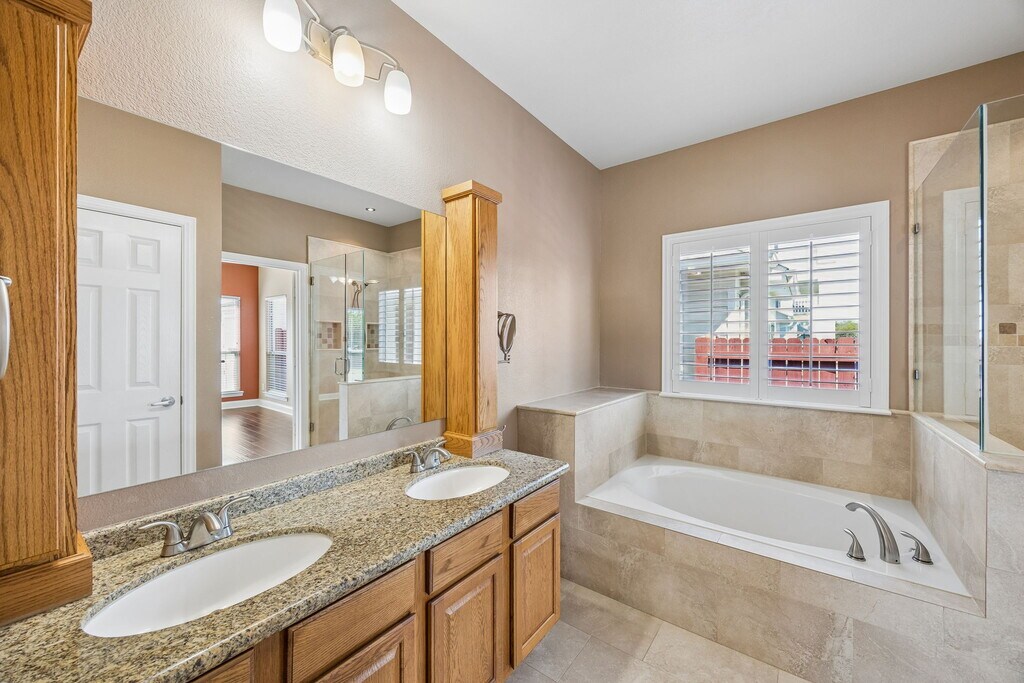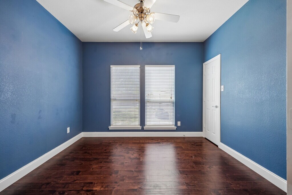 WELL MAINTAINED 4 BEDROOM OR 3 BEDROOM WITH AN OFFICE, 2 BATHROOM, CRAFTMAN-INFLUENCED HOUSE ON A HUGE ONE THIRD ACRE CORNER LOT WITH SOLAR PANELS IN FRISCO ISD AND EAST MCKINNEY. As you enter from the Flagstone walkway and past the Covered Front Porch, once inside you will notice Wood Flooring Throughout in all main areas of the house and into all Bedrooms. To your right, you have a hallway with 3 Bedrooms with Ceiling Fans and Walk-in Closets, and 1 Full Bathroom. One of the bedrooms could be used as an office since it has french doors. The Primary Bedroom is Privately tucked away from the other 3 rooms and is located in the back of the house overlooking the Backyard. This room has Ceiling Fan, Large Walk-in Closet, and Ensuite Bathroom with Granite Counters, Garden Tub, and Separate Shower. Outside the Primary Room is the Main Living Area with Corner Fireplace and Built-ins, plus Breakfast Bar leading to the Kitchen with 42-Inch Cabinets, Black Stainless Steel appliances including Refrigerator, Dishwasher, Gas Cooktop, Gas Oven, and Microwave, plus eat-in Breakfast Nook. Through the doorway and center of the house has a nice Formal Dining area or Flex Space that can be used as a playroom, Office, or Workout Room. The Laundry Room leading to the Garage has plenty of space for Refrigerator or Chest Freezer, and Washer + Dryer included. The Front-Facing 2-car Garage has lots of built-in cabinets and shelving plus some additional storage on the ceiling. And of course all of this sits on a large corner lot with a fenced Backyard equipped with Covered Patio, Playset, and Fruit Trees. Washer, Dryer, and Fridge included. Community offers playground, Swimming Pool, jogging and walking trails. Easy Approval process. Managed by a professional Company as you can tell by the photos and description so rest assured you will have a great experience here. 3D Tour and floorplan available online on other websites. This home is available for immediate move-in and easy to apply for by scanning the QR code in the last photo or in the house.