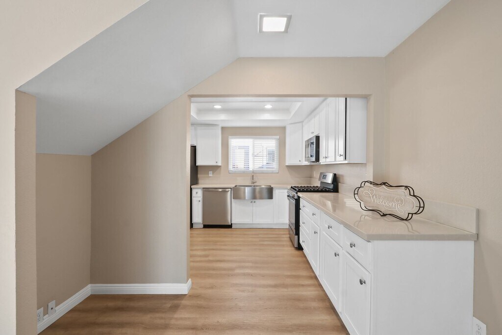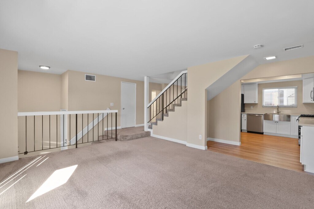 Welcome home to this spacious 2 bedroom multi-level condo in La Habra. It features a recently remodeled kitchen with newer cabinets, countertops, and appliances. There is an open kitchen nook and guest bathroom on the main level and a spacious living room area. The main and upper-level features newer carpet and flooring throughout. Each upstairs bedroom has ample closet space and a separate sink area. This freshly painted condo is packed with great amenities including a direct access private 2 car garage with convenience of a washer and dryer, central air-conditioning, vaulted ceiling, refrigerator, and much more. The skylight brings in natural light and there is no unit above or below. Enjoy use of the recent HOA exterior renovations including a remodeled community pool and tennis court, and grass greenbelt. The location is convenient to nearby shopping, dining and entertainment. Take a virtual tour: