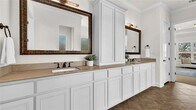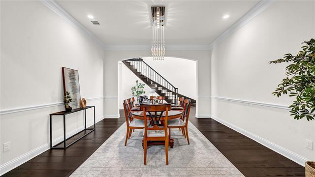Fabulous, custom-designed Toll Brothers home on a wooded cul-de-sac, within the gated Latera community. This impeccable home offers a spacious layout with high-end finishes and a huge, fenced yard for all of your heart's desires! Thoughtful floor plan provides ample space for generous living and entertaining. The open floor plan is enhanced by natural light and wood floors, two staircases and numerous high-end upgrades. Grand entry with stately double doors and curved staircase. A large private study off the foyer features a beautiful bay of windows and high ceilings. The thoughtful floor plan features a formal dining room perfect for entertaining at the center of the home. The two-story great room boasts a corner fireplace, soaring ceilings and stacked windows and is conveniently open to the gourmet kitchen, equipped with stainless steel appliances, built-in refrigerator, large breakfast bar island and walk-in pantry. The Primary Suite downstairs features a sitting area, wonderful natural light and a luxurious master bath with a walk-in shower, dual sinks, garden tub and impressive walk-in closet. An additional downstairs bedroom features an ensuite bath and enhanced privacy in a separate wing of the home. Upstairs, the home offers a spacious game room with high ceilings, a great media room with wet bar and three additional, sizable bedrooms, each with its own full bath. The huge, pool-sized backyard is perfect for entertaining and a full bath downstairs is ideal for future pool plans. Situated on a 0.37-acre lot, the property includes a swing drive with single and two-car garages. Residents of the Latera community are close to DNT, 380 and Preston Road...exciting nearby developments include The Star, Toyota Stadium, PGA headquarters, and future Firefly Park. The gated community is ideally situated mere minutes from both Frisco and Prosper retail, dining, sports fields and entertainment!