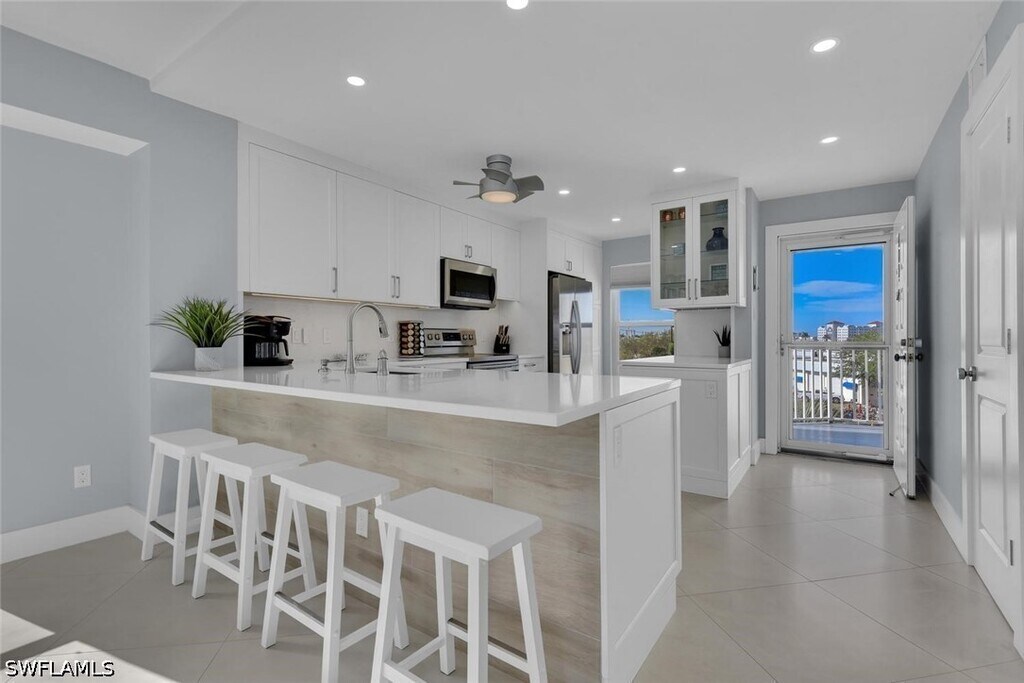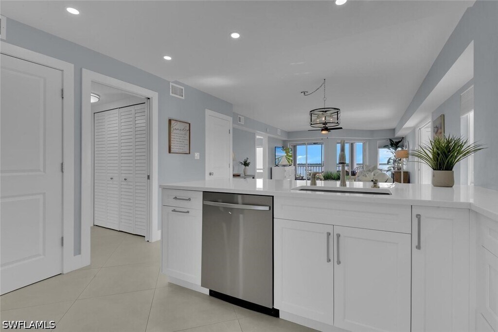 Welcome to your serene waterfront escape on Marco Island! Nestled in a beautifully remodeled end-unit at Grand Bay,this light-filled two-bedroom plus den,two-bath condo features stunning panoramic water views,where you can unwind and take in breathtaking sunsets from the comfort of your private lanai. Inside,the space is thoughtfully designed with a bright,open layout and a clean,modern coastal aesthetic. The fully updated kitchen is both stylish and functional,featuring quartz countertops,stainless steel appliances,a spacious island,and a wine cooler—perfect for entertaining or enjoying a quiet evening in. The primary suite serves as a peaceful sanctuary with a king bed,walk-in closet,and a spa-like ensuite bath complete with a walk-in shower and dual vanities. The guest bedroom offers two double beds,while the den provides additional flexibility with a queen Murphy bed—ideal for families or extra guests. A second full bathroom with a tub/shower combo ensures comfort and convenience for all. Beyond the condo,enjoy the best of Marco Island living with access to a community pool,tennis and pickleball courts,and close proximity to local favorites like waterfront dining and casual tiki spots. Whether you're sipping your morning coffee overlooking the bay or ending the day with a sunset breeze,this peaceful,sun-drenched retreat is the perfect place to relax,recharge,and experience the beauty of the coast.