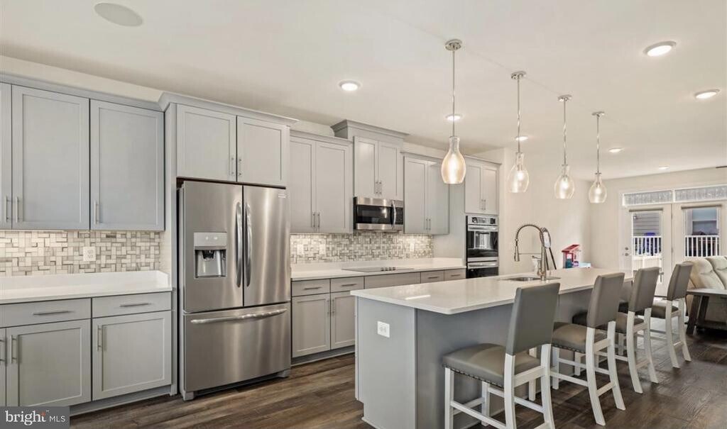 4bed 3.5baths 2 car garage oversized townhome with 2 ft bump out, about 3200sq, 9 ft ceilings throughout out the home creates an open and airy feel. One of the largest models, the main floor boasts an expansive island as the main focal point while complimenting the refreshing light grey shaker-style cabinets, backsplash, pendant lighting, and stainless steel appliances. Beautiful wide plank wood floors are along the stairs, the entire main and lower level. The open floor plan includes a living room that has glass doors leading to the deck- perfect for indoor and outdoor entertaining! Upstairs the primary bedroom has a large walk-in closet and ensuite bath. Lower level has additional 4th bedroom, full bath, recreation room, and walk-out to backyard.