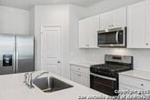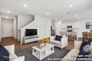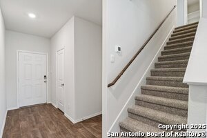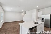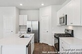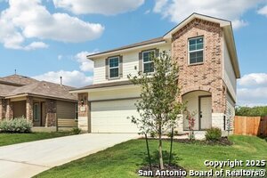 Step into The Grace floor plan in Hacienda in San Antonio, TX. This home showcases 2 classic front exteriors, full yard landscaping and irrigation and a 2-car garage. Inside this 4 bedroom, 2.5 bathroom home, you will find 1952 square feet of living space designed to meet your needs. The arched front patio opens to a grand foyer which then leads to a spacious living room. The living room blends seamlessly into the kitchen and dining area in an open concept floorplan. Your kitchen is built for the ultimate home chef and offers granite counter tops, stainless steel appliances, and a kitchen island overlooking the living room. Don't forget a deep, single basin kitchen sink for convenience and ease. The staircase leads to the upstairs main bedroom suite, all secondary bedrooms, and your utility room. The Grace floor plan is ideal if you want to keep your entertaining space and private space separate. The upstairs main bedroom has an attached bathroom that includes a tiled walk-in shower, separate water closet and plenty of storage space with built-in shelving and a grand walk-in closet.