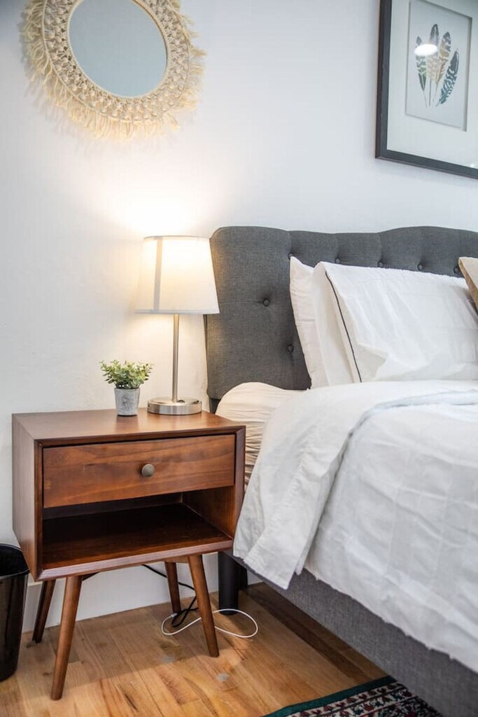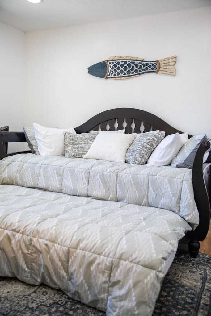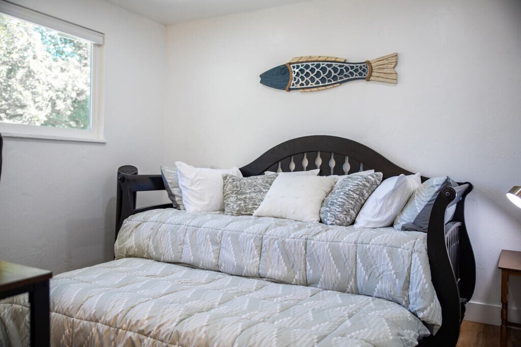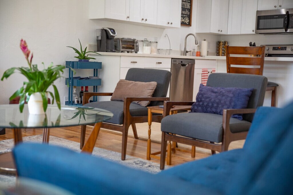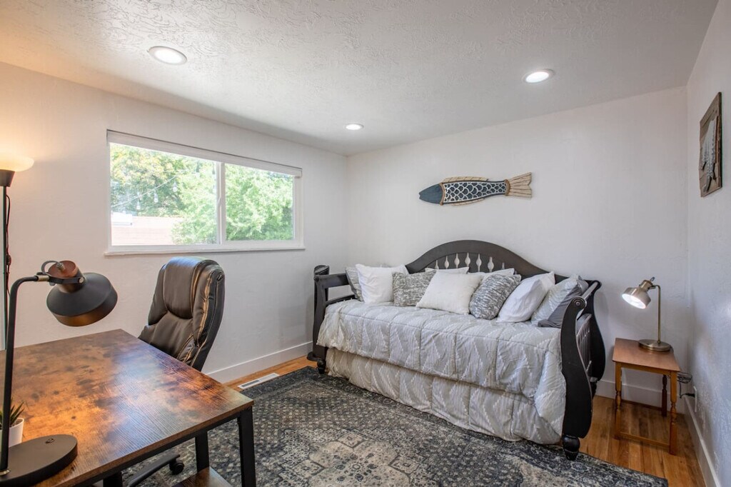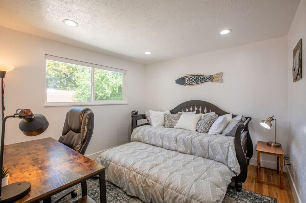 Discover the charm of The Lily Pad, a cozy 3-bedroom, 1-bath home in Sandy, UT. Located near shopping, dining, and entertainment, this home offers a spacious backyard perfect for relaxation. Whether you're here for a quick getaway, a business trip, or family time, The Lily Pad provides a comfortable and convenient stay just minutes from top attractions. The living area is bright and open, featuring stylish mid-century furniture, a large Smart TV, and plenty of natural light, making it perfect for unwinding after a day out. The fully equipped kitchen boasts stainless steel appliances, island seating for three, and a dining table for four, ideal for cooking, gathering, and enjoying meals together. Pets are welcome at the property for a fee of $10 per pet, per day. Guests are required to pick up after their animals and will be charged $10 per exterior location if not cleaned up by the guest. If animals cause damage to the property, the guest will be responsible for paying for any repairs or replacement. For unauthorized pets, a $250 fee will be assessed. The Lily Pad is conveniently located near major highways for an effortless commute. Enjoy close proximity to schools, parks, and walking trails, including the Dimple Dell Trail, which runs alongside the home. Distances to local attractions include Mountain America Expo Center at 5 minutes, Alta/Snowbird Ski Resorts at 26 minutes, Downtown Salt Lake City at 22 minutes, Salt Palace Expo Center at 23 minutes, and SLC International Airport at 24 minutes. The home is a duplex with shared walls, and entrances are separate. You will hear the tenant in the second apartment. Smoking or vaping is not allowed on the premises, with a $200 per day fee for violations. Quiet hours begin at 10:00 PM each night and continue until sunrise. Please lock and close all windows and doors upon leaving to avoid wildlife or bug encounters. Outdoor security cameras may be in use and are disclosed on the listing. No cameras are located in or pointing to indoor spaces. Includes a dedicated workspace and high-speed WiFi, perfect for remote work needs. A laptop computer is not included. [SI]