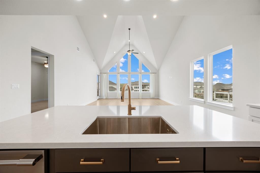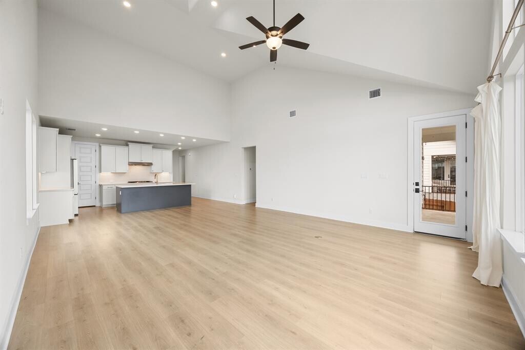 This light-filled two-story home offers an open, well-designed layout with dramatic 20-foot ceilings in the entry and living area. The main level features LVP wood flooring throughout and a seamless flow between the kitchen, living, and dining spaces. Also on the first floor are a secondary bedroom and full bathroom, laundry room, mudroom, and a spacious primary suite. The primary suite includes a spa-style bathroom with a soaking tub, walk-in shower, dual vanities, and a large walk-in closet with custom storage. The kitchen is designed for both everyday living and entertaining, featuring quartz countertops, a large eat-in island, KitchenAid professional appliances, a 36-inch gas cooktop, and a walk-in pantry with a built-in coffee bar. Upstairs, two additional bedrooms share a full bathroom, along with a media room and an additional living area that offers flexible use. A Murphy bed in the fourth bedroom/office can remain or be removed based on tenant preference. Outside, the extended covered patio offers sunset views and a gas hookup for grilling. The large backyard backs to green space and includes a gated dog run with direct access from the garage. The 2.5-car garage provides ample space and includes built-in storage. Located in the Headwaters community, residents enjoy resort-style amenities including a pool, fitness center, outdoor fireplace, playground, dog park, gas grills, social events, and miles of walking trails. Nearby wineries, distilleries, and restaurants add to the lifestyle appeal. Located in the top-rated Dripping Springs ISD and zones to brand new Wildwood Springs Elementary school located in Headwaters Community. Spectrum high-speed internet and basic cable included in rent. *Available March 1* MLS ID 3947191