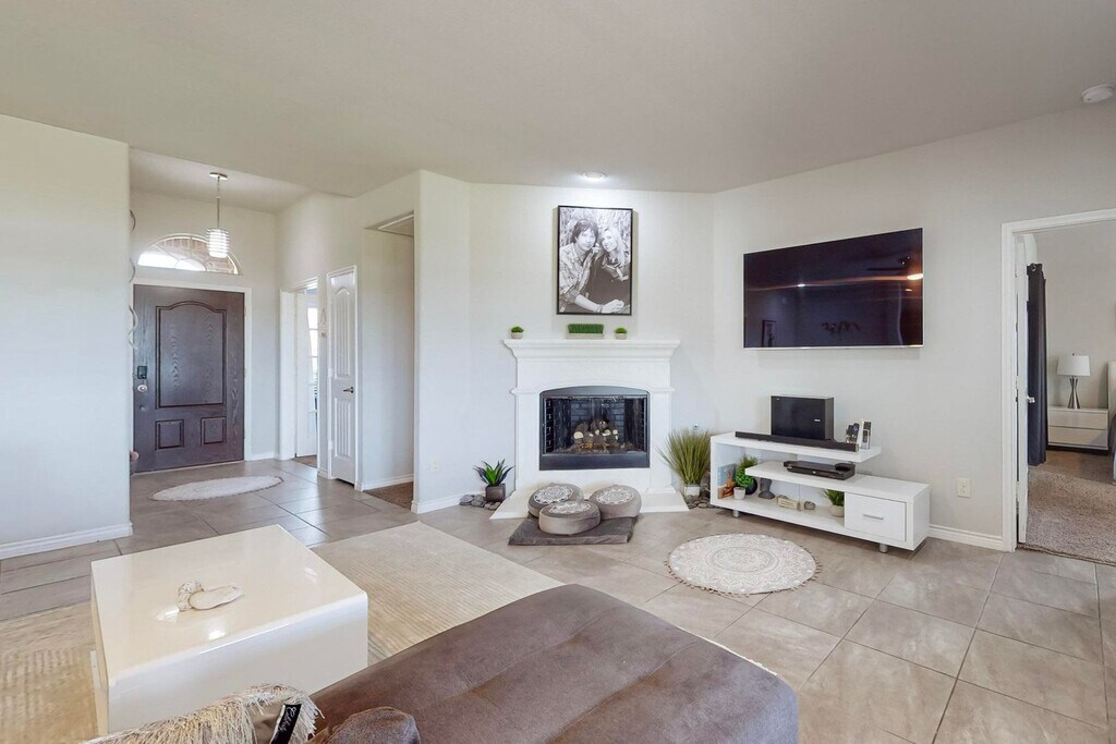 Find tranquility and peace as you soak in breathtaking LAKE VIEW sunsets from your expansive, landscaped backyard, complete with a custom hand-laid flagstone patio and an outdoor mounted TV—perfect for enjoying your favorite shows or sports events under the stars. This serene 4-bedroom, 2-bath home on a stunning lot radiates charm and elegance. Imagine yourself relaxing in a living room with upgraded designer stone flooring, warmed by the soothing glow of a natural gas log-burning fireplace. For the culinary artist, the kitchen is a harmonious space with Sunrise maple godiva cabinets and granite countertops. Don’t miss the custom features in the pantry—it’s a delightful surprise! Retreat to the private owner’s sanctuary at the back of the house, offering serene lake views, an en-suite bath with a luxurious soaking tub, a separate shower, and two walk-in closets. Enjoy the ample space in the oversized 2-car garage, complete with storage and room for an outdoor refrigerator or freezer. Pets are welcome to share in this peaceful haven! Please note, we do not accept housing vouchers at this time.