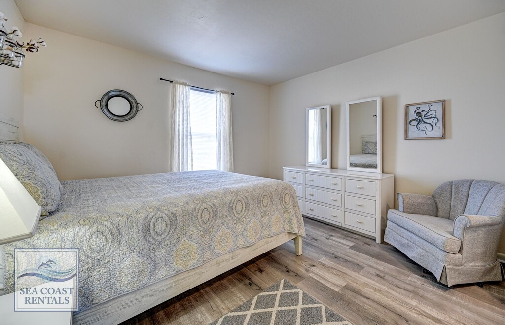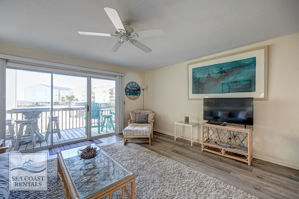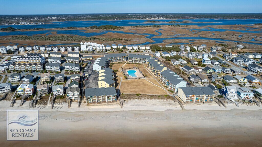 FURNISHED OFF-SEASON MONTHLY RENTAL NOW AVAILABLE Light and Breezy… The Surf Condo 616 has the overall feel of a quaint, yet spacious, 1-bedroom condo. Sitting on your private balcony, you can see the ocean, smell the salt air, and hear the waves rolling in. You will also be able to see the large pool in the center of the complex’s courtyard. A perfect work-from-home location. Spend your breaks, lunch, in-between Zoom calls, or your whole day out on the beach enjoying the sun and the sand. Located in Surf City, it is only a mile away from many restaurants and beach shops. Decorated in soft creams, whites, and beige's, you’ll feel relaxed and calm while staying here. The living room has a full-sized futon that folds up into a couch, there is a soft, comfy chair to sit back, put your feet up on the footstool, and catch up on a favorite TV show, read a good beach read, or just watch the seagulls sail by. There is a full kitchen with everything you’ll need to grab an easy meal before catching a few rays. The dining room table sits 4, and there are 3 additional stools for the kitchen bar. The hallway has a built-in set of bunk beds (2 twin mattresses). The bunk beds are great for extra bedding or a perfect spot to stow away your luggage. The full bath is in the hallway with a connecting door to the bedroom. There is a small water closet directly off the bedroom. Coin-operated laundry in the building. The patio features a resin high-top table and 4 stools, along with 2 high-rise resin chairs to add to your relaxation. Another bonus is 2 private covered parking spaces located directly below the unit. This condo is oh-so-easy and relaxing. Watching the gauzy curtains blowing in the salt air will remind you of carefree vacations gone by that can now be enjoyed again year after year. Who's ready for the beach?! **Please contact Ann at Sea Coast Rentals for further information and/or to check available dates. Check out all our rentals: both furnished off-season and unfurnished long-term. **